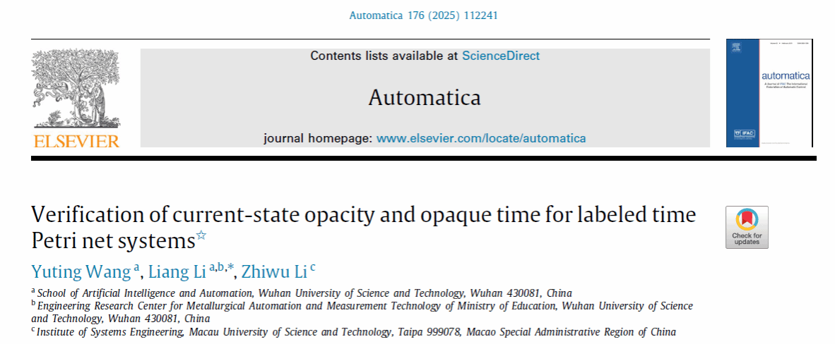 近日,集團碩士研究生在國際控制領(lǐng)域頂級期刊《Automatica》上以長(cháng)文(Regular Paper)形式發(fā)表題為“Verification of Current-State Opacity and Opaque Time for Labeled Time Petri Net Systems”的研究論文。該論文第一作者為我校2022級碩士研究生王宇婷,其導師黎良擔任通訊作者,永利集團88304官網(wǎng)為論文的第一完成單位。