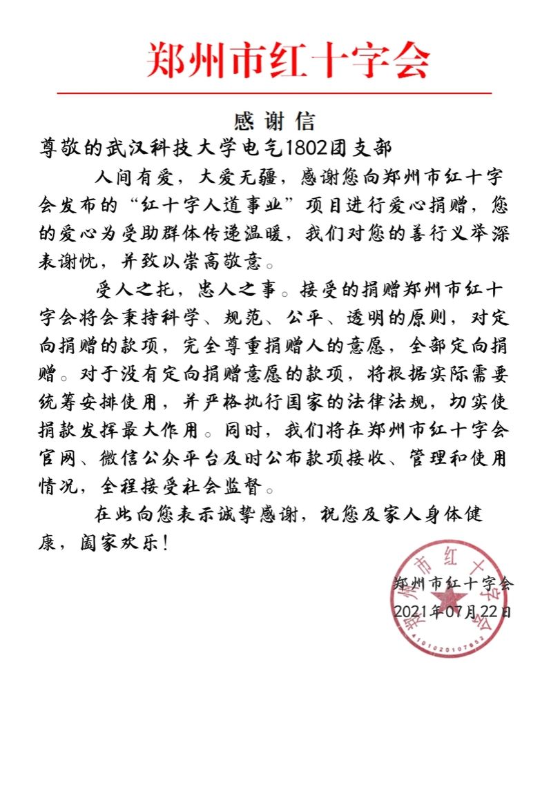 “人間有愛(ài),大愛(ài)無(wú)疆,感謝您向鄭州市紅十字會(huì )發(fā)布的紅十字人道事業(yè)項目進(jìn)行愛(ài)心捐贈?!?月22日上午,集團電氣1802班團支書(shū)茹偉宇在支部成員的一致贊同下,將評選為“紅旗團支部”的600元獎金捐給鄭州遭受洪災的人民,幫助他們挺過(guò)難關(guān)。