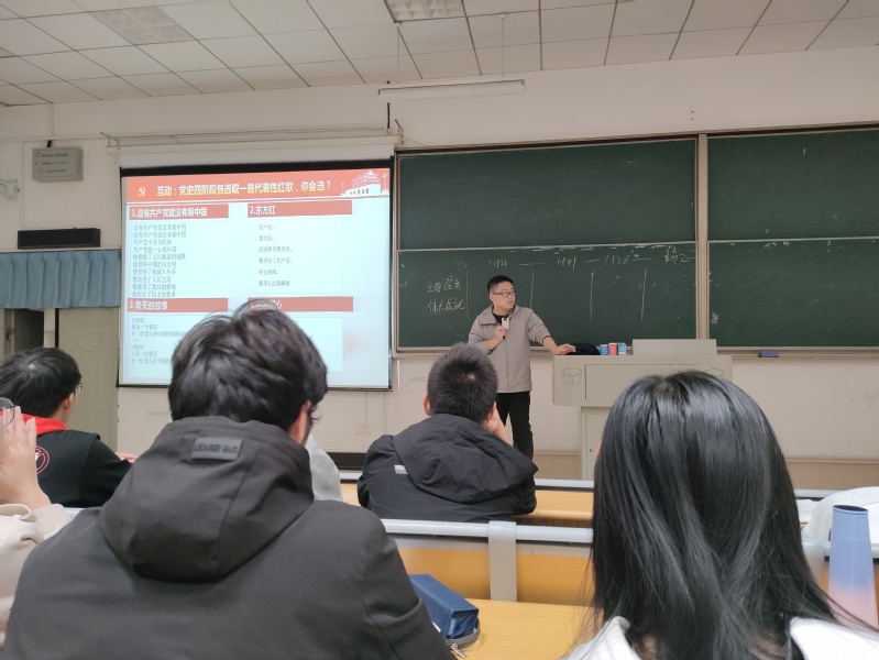 黨校第一課開(kāi)始,主講人鄒龍首先進(jìn)行了互動(dòng)環(huán)節,他詢(xún)問(wèn)在場(chǎng)學(xué)生:“如果為黨史四階段各選取一首代表紅歌,你會(huì )選擇什么?”在現場(chǎng)學(xué)生的積極互動(dòng)后,他給出了自己的答案:“《沒(méi)有共產(chǎn)黨就沒(méi)有新中國》、《東方紅》、《春天的故事》、《不忘初心》”,并開(kāi)始了對中國共產(chǎn)黨光輝歷程的講解。